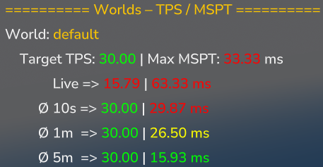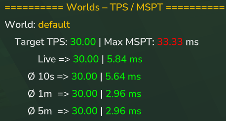 It shows the configured target TPS/MSPT, the real live TPS/MSPT, and average TPS/MSPT values for the last 10 seconds, 1 minute, and 5 minutes.